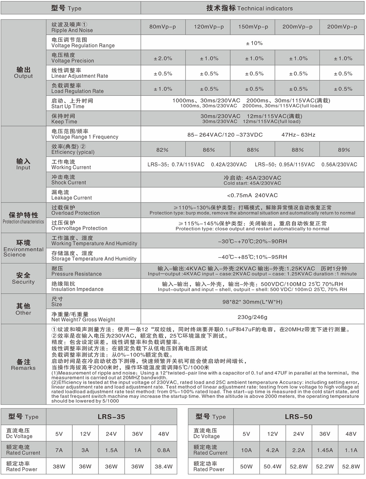 LRS-35 and 50 series are 35W single group output enclosed power supply with 30mm low profile design. They use 85-264VAC full range AC input. The whole series provides 5V, 12V, 15V, 24V, 36V and 48V output. In addition to the efficiency of up to 91.5%, the design of the metal mesh enclosure has enhanced the heat dissipation capability, so that the LRS-35 can work in the temperature range of - 30C to+70C without fans. The terminal system can easily meet the international energy requirements by providing ultra-low no-load power consumption (less than 0.3W). LRS-35 and 50 have complete protection function and 5G vibration resistance; It complies with TUVEN60950-1, EN60335-1, EN61558-1/- 2-16, UL60950-1 and GB4943 international safety regulations. LRS-35 and 50 series provide a cost-effective solution for various industrial applications.