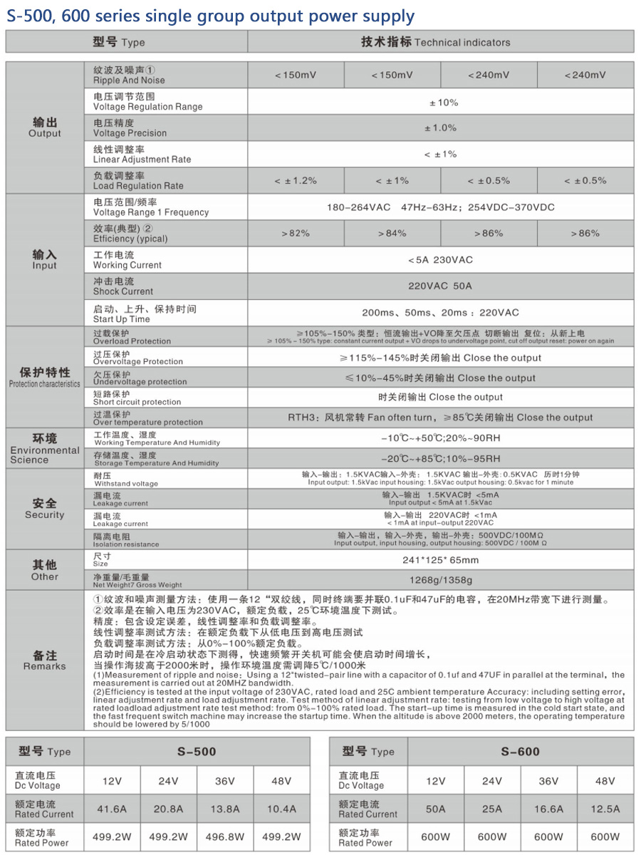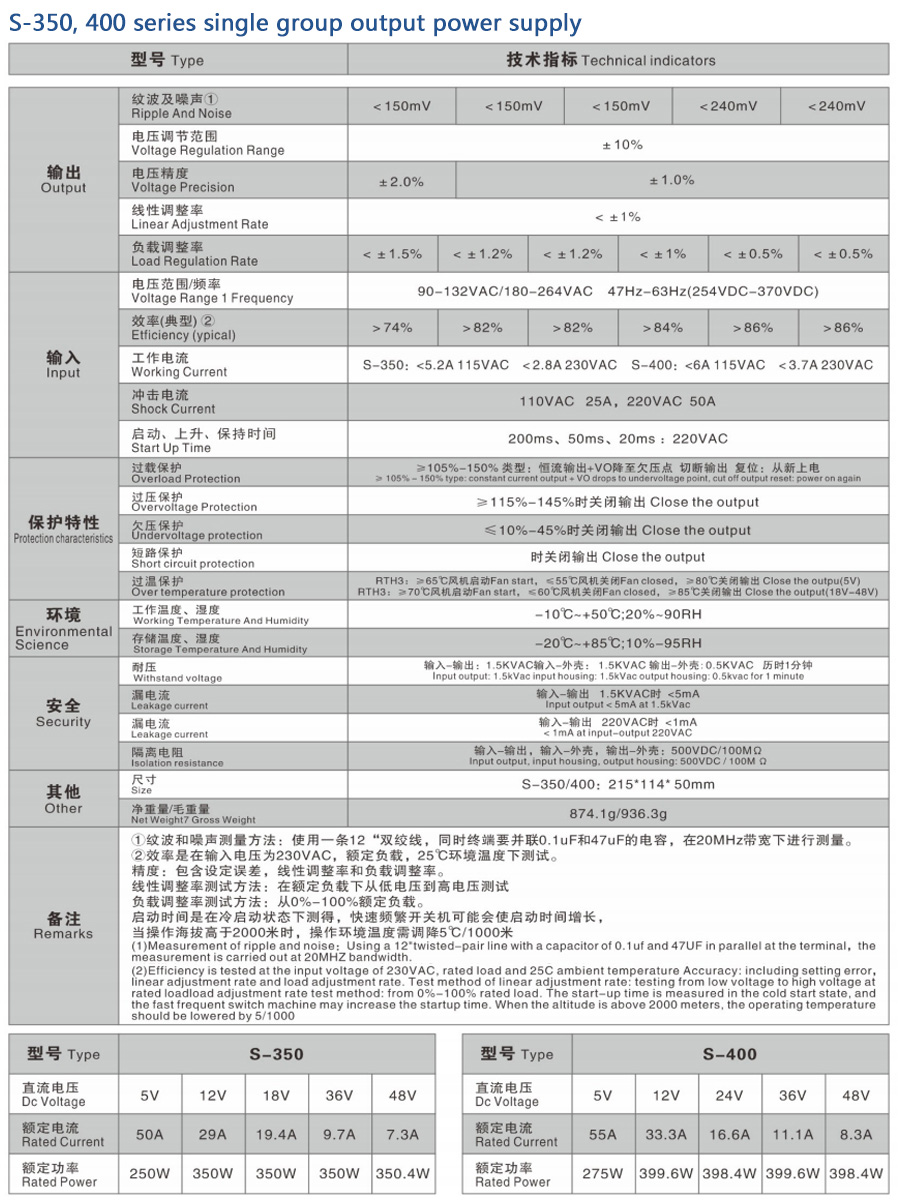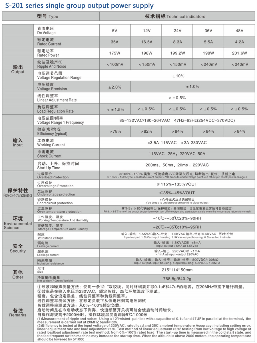S-250 series is a 250 single group output enclosed power supply, which adopts 85-264VAC full range AC input, and the whole series provides 5V, 12V, 15V, 24V, 36V and 48V output. In addition to the high efficiency of 91.5%, the design of smart fan with metal mesh enclosure enhances the heat dissipation capability, making the S-201 work more stably in harsh environments, and making the terminal system easily meet international energy requirements. S-250 has complete protection function; It complies with TUV EN60950-1, EN60335-1, EN61558-1/- 2-16, UL60950-1 and GB4943 international safety regulations. S-250 series provides a cost-effective solution for various industrial applications.