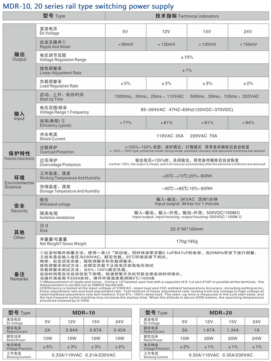 MDR-10, 20, 40, 60, 100 series is a 10, 20, 40, 60, 100 single group output enclosed power supply, which uses 85 - 264VAC full range AC input to provide 5V, 12V, 15V, 24V, 36V and 48V output. In addition to the high efficiency of 91.5%, the design of smart fan with metal mesh enclosure has enhanced the heat dissipation capacity, enabling the MDR-10, 20, 40, 60, 100 to work in the temperature range of - 30 ° C to+70 ° C without a fan, which can easily enable the terminal system to meet international energy requirements. MDR-10, 20, 40, 60 and 100 have complete protection function and 5G vibration resistance; It complies with TUV EN60950-1, EN60335-1, EN61558-1/- 2-16, UL60950-1 and GB4943 international safety regulations. MDR-10, 20, 40, 60 and 100 series provide a cost-effective solution for various industrial applications.