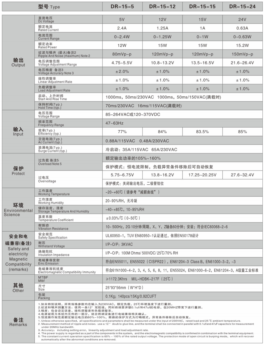 DR-15 series is a 15W single group output enclosed power supply, which adopts 85-264VAC full range AC input. The whole series provides 5V, 12V, 15V, 24V, 36V and 48V output. In addition to the efficiency of up to 91.5%, the design of the metal mesh enclosure enhances the heat dissipation capability, so that the DR-15 can work in the temperature range of - 30C to+70 ° C without fans. The terminal system can easily meet international energy requirements. DR-15 has complete protection function; It complies with TUVEN60950-1, EN60335-1, EN61558-1/- 2-16, UL60950-1 and GB4943 international safety regulations. The DR-15 series provides a cost-effective solution for various industrial applications.