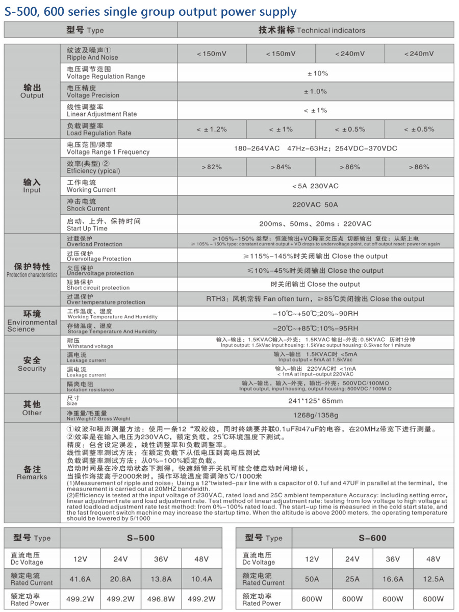 S-500 and 600 series are 500 and 600 single group output enclosed power supplies, which use 85-264VAC full range AC input. The whole series provides 5V, 12V, 15V, 24V, 36V and 48V output. In addition to the high efficiency of 91.5%, the design of smart fan with metal mesh enclosure enhances the heat dissipation capability, making the S-201 work more stably in harsh environments, and making the terminal system easily meet international energy requirements. The S-500 and 600 have complete protection functions; It complies with TUV EN60950-1, EN60335-1, EN61558-1/- 2-16, UL60950-1 and GB4943 international safety regulations. S-500 and 600 series provide a cost-effective solution for various industrial applications.