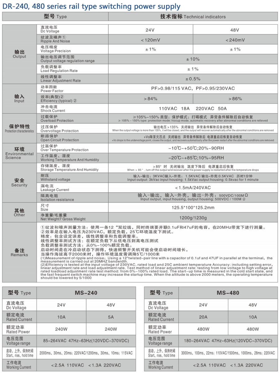 DR-120, 240, 480 series are 240, 480W single group output enclosed power supply, which use 85-264VAC full range AC input to provide 5V, 12V, 15V, 24V, 36V and 48V output. In addition to the efficiency of up to 91.5%, the design of smart fan with metal mesh enclosure enhances the heat dissipation capability, so that DR-120, 240, 480 can work in the temperature range of - 30C to+70 ° C without a fan. The terminal system can easily meet international energy requirements. The DR-120, 240 and 480 have complete protection functions; It complies with TUV EN60950-1, EN60335-1, EN61558-1/- 2-16, UL60950-1 and GB4943 international safety regulations. DR-120, 240 and 480 series provide a cost-effective solution for various industrial applications.